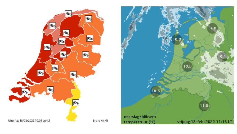 Het KNMI heeft voor vrijdag 18 feb 2022 (vanaf 14.00 uur) code ROOD afgegeven voor een groot deel van Nederland.